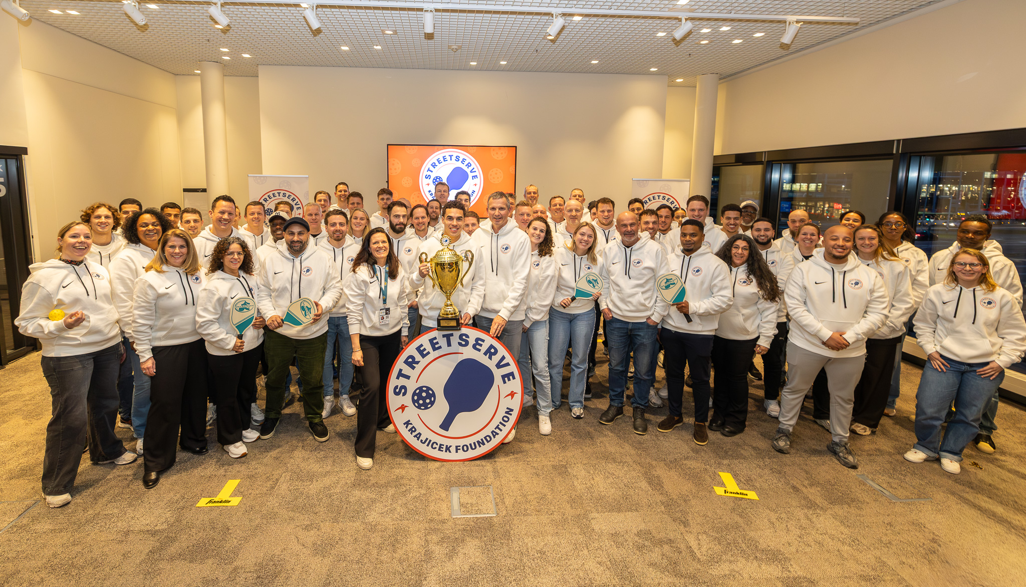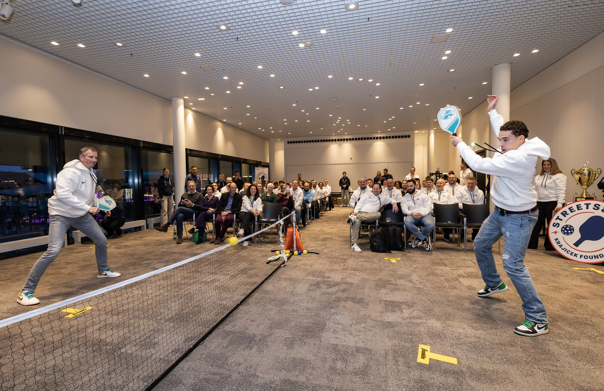 Onder luid applaus van 80 sportprofessionals uit het hele land en knallende confetti gaven Richard Krajicek en StreetServe-ambassadeur Noah Washington het officiële startsein door pickleball-ballen het publiek in te slaan.